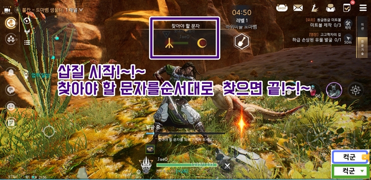 이제 본격적으로 노동을 해봅시다. 발굴 시작!! 화면 중앙에 찾아야할 문자가 나오는데요. 잘 기억하고 있다가 화면 우측하단에 표시되면 순서대로 터치해주세요.