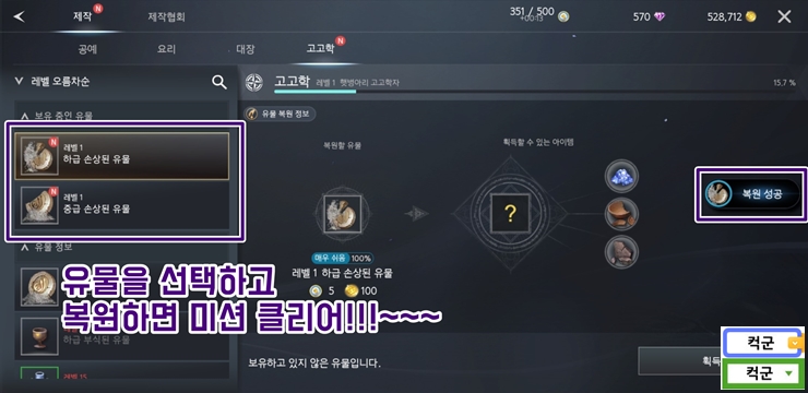 발굴 노가다 작업이 끝났으면 이제 미션을 클리어해봅시다. 미션이 아니라도 제작에서 고고학 유물 발굴 레벨을 높여 봅시다. 제작 및 제작협회 화면에서 왼쪽에 발굴 수집한 손상된 유물을 선택해서 오른쪽 화면에서 "복원"을 누르시면 됩니다. 이걸로 끝!!!!
