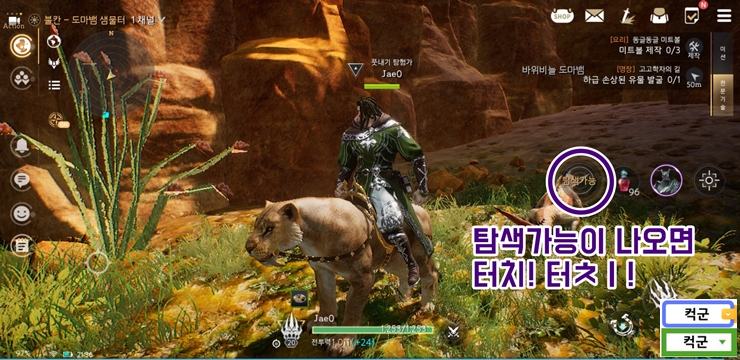 트라하 유물 탐색 그러면 위 스크린샷과 같이 탐색가능이 표시되거나 탐색 화면이 나옵니다. 탐색가능 표시나 나오거나 삽 모양이 나오면 터치하세요.