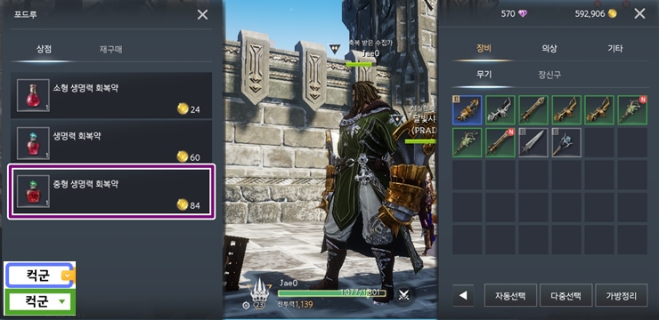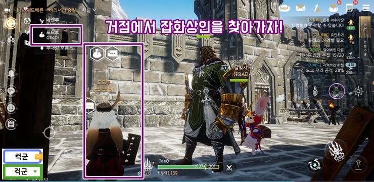 여기서 잡화상인을 찾아서 터치하세요. 자동으로 잡화상인에게 이동합니다. 그 다음은 앞서 설명한 것처럼 생명력 회복약을 두둑하게 구입하는 것입니다.
