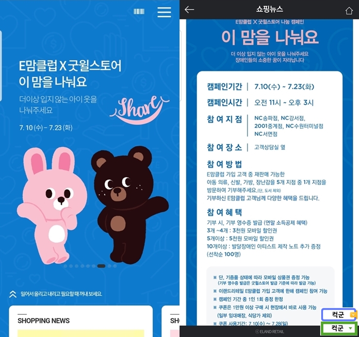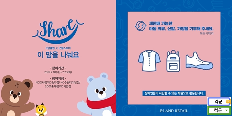 이랜드리테일의 E맘클럽 x 굿윌스토어 나눔캠패인은 집에서 안입는 아이옷, 가방, 신발, 장난감 등을 기부받습니다. 기부 시 NC백화점 모바일 할인권도 받고요. 기부 영수증을 발급받기 때문에 연말정산에 소득공제로 사용할 수 있고요. 기부받은 물건은 굿윌스토어에서 재판매되고요. 판매수익은 장애인들을 위한 곳에 사용됩니다.