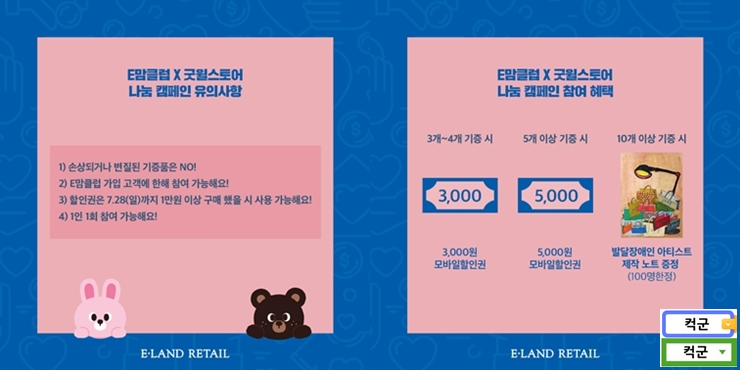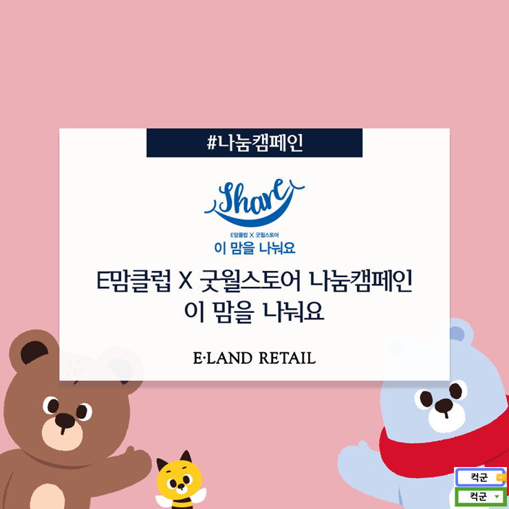 더불어 기부인증샷을 인스타그램에 #E맘클럽 #이맘을나눠요 해시태그와 함께 업로드하면 2명을 선정하여 이랜드 모바일 상품권 5만원을 증정하니, 한 번 도전해보는 것도 좋겠고요.