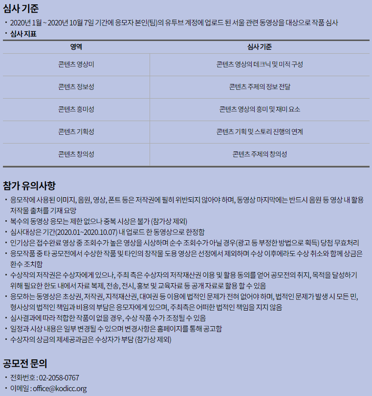 심사기준을 보니 서울을 주제로한 콘텐츠라면 올해초에 올려둔 영상이라도 상관없을 듯 하네요. 영상 제작시 위의 심사기준을 참고하시면 수상하는데 도움이 되겠습니다.