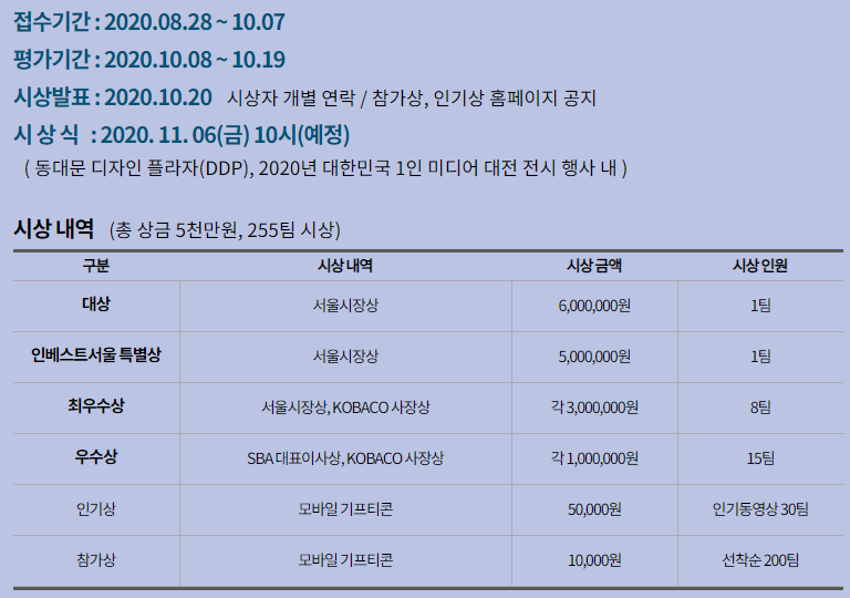 영상 공모전의 접수기간은 10월 7일!!! 그렇게 시간이 넉넉하게 넘지 않았습니다. 지금 바로 카메라를 들고 밖으로 나가야 될지도!! 시상발표는 2020년 10월 20일이고요. 서울메이드 홈페이지에서 수상작을 확인할 수 있습니다. 시상식은 2020년 11월 6일 동대문 디자인 플라자에서 진행하고요. 작년 시상식을 보니 나름 알차고 화려하게 진행했더라고요. 작년 시상식 사진은 포스팅 하단에 첨부해놓겠습니다.